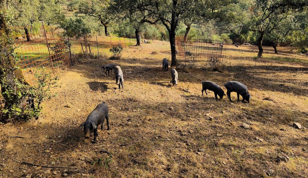 El recorrido hasta el final de esta primera jornada es una sucesión de pequeñas sierras que separan distintos valles adehesados donde se cría cerdo ibérico y ganado bovino. Para quienes venimos de zonas más secas, el entorno nos pareció espectacularmente verde. Sin embargo, los vecinos nos comentaron al finalizar las etapas que aún falta mucha lluvia para alcanzar los niveles medios de precipitación de la comarca.